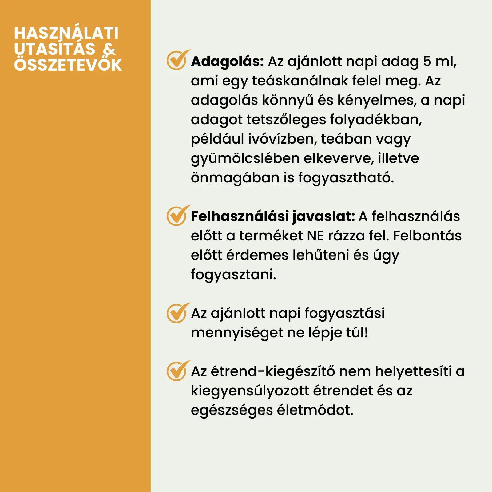 Adagolás: Az ajánlott napi adag 5 ml, ami egy teáskanálnak felel meg. Az adagolás könnyű és kényelmes, a napi adagot tetszőleges folyadékban, például ivóvízben, teában vagy gyümölcslében elkeverve, illetve önmagában is fogyasztható.