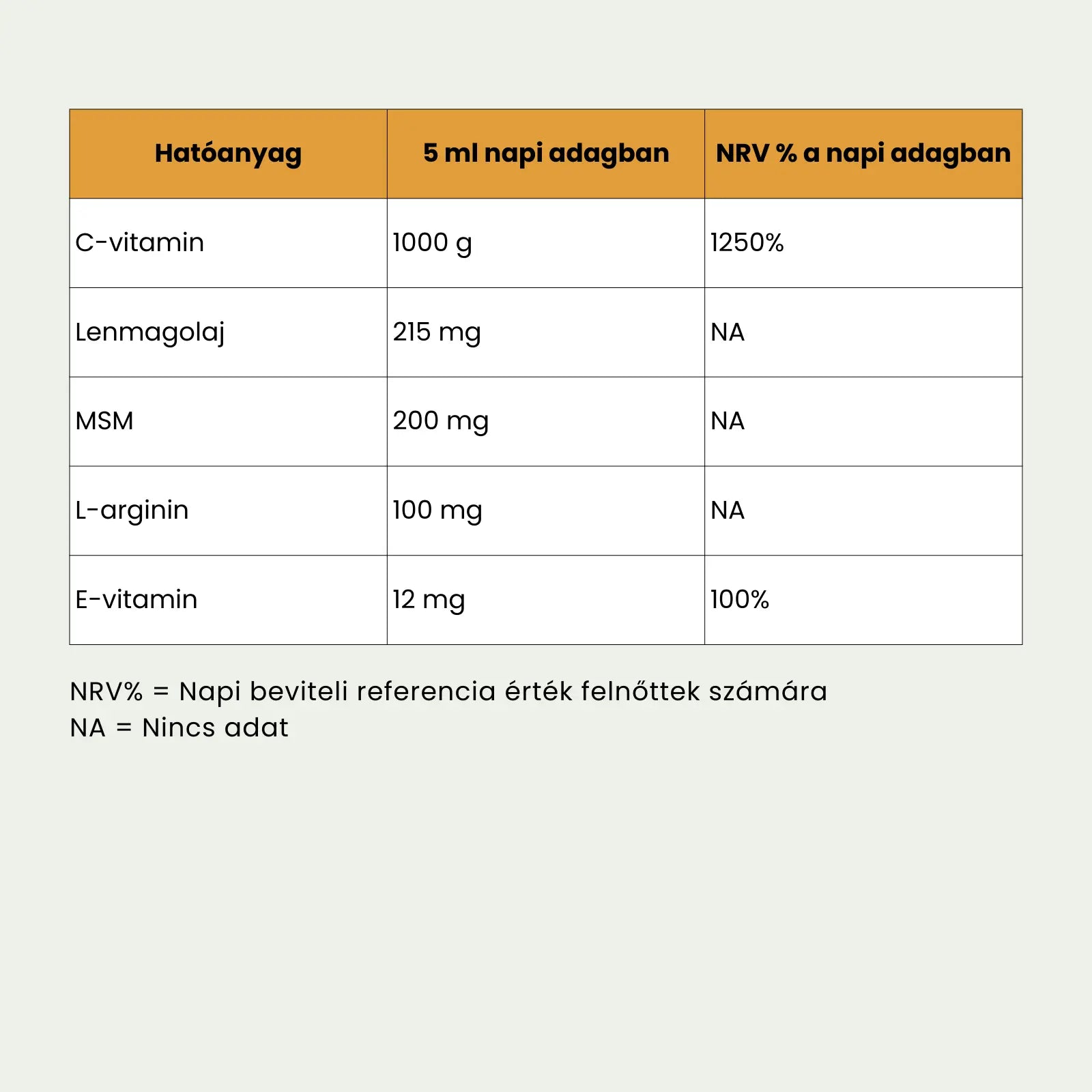 C-Vitamin: 1000 mg (1250%), Lenmagolaj: 215 mg (NA), MSM: 200 mg (NA), L-arginin: 100 mg (NA), E-Vitamin: 12 mg (100%)